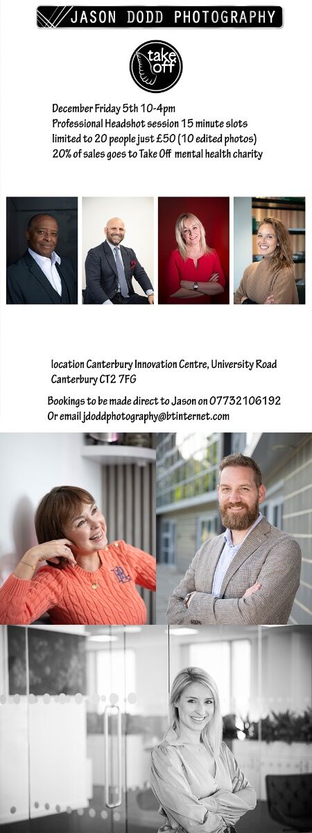 The portrait sessions will be from 10am to 4pm, address details are on the flyer and just need to be booked direct with me. You will have ten images which can be used for any purpose, these are hi-resolution photos and could be used for Linked In profiles, editorial usage, websites etc. The photos will be sent over direct to you and at £50 are an affordable way to update your current photos, 20% of the sales will go direct to the Canterbury based Take off charity which supports people with mental health issues.